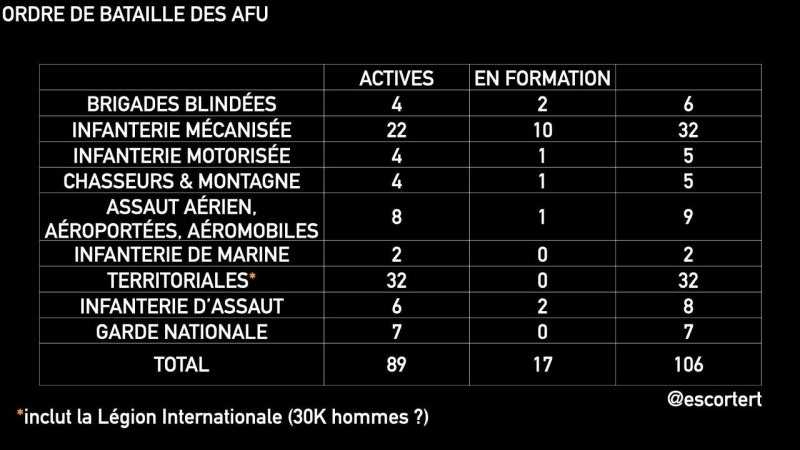 Фомин добавил, что сейчас в сухопутных войсках ВСУ, силах территориальной обороны и Национальной гвардии Украины имеется или формируется суммарно 100 общевойсковых и шесть танковых бригад. В общей сложности они должны включать до 700 батальонов пехоты и 35-40 эквивалентных танковых батальонов, а общая численность личного состава, с учетом тыла и частей обеспечения может достичь 1,3 млн человек.
