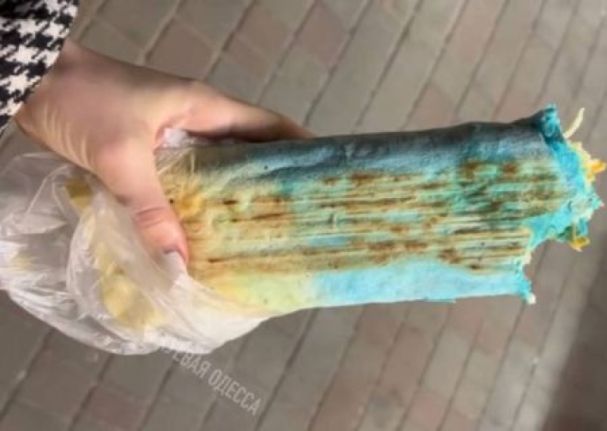 В Одессе изобрели «патриотическую шаурму». Мясо и овощи заворачиваются в лаваш, окрашенный в цвета украинского флага.