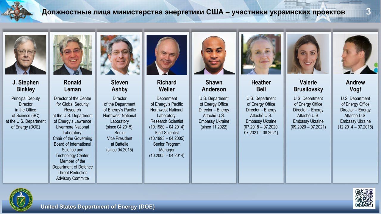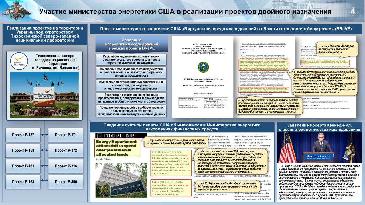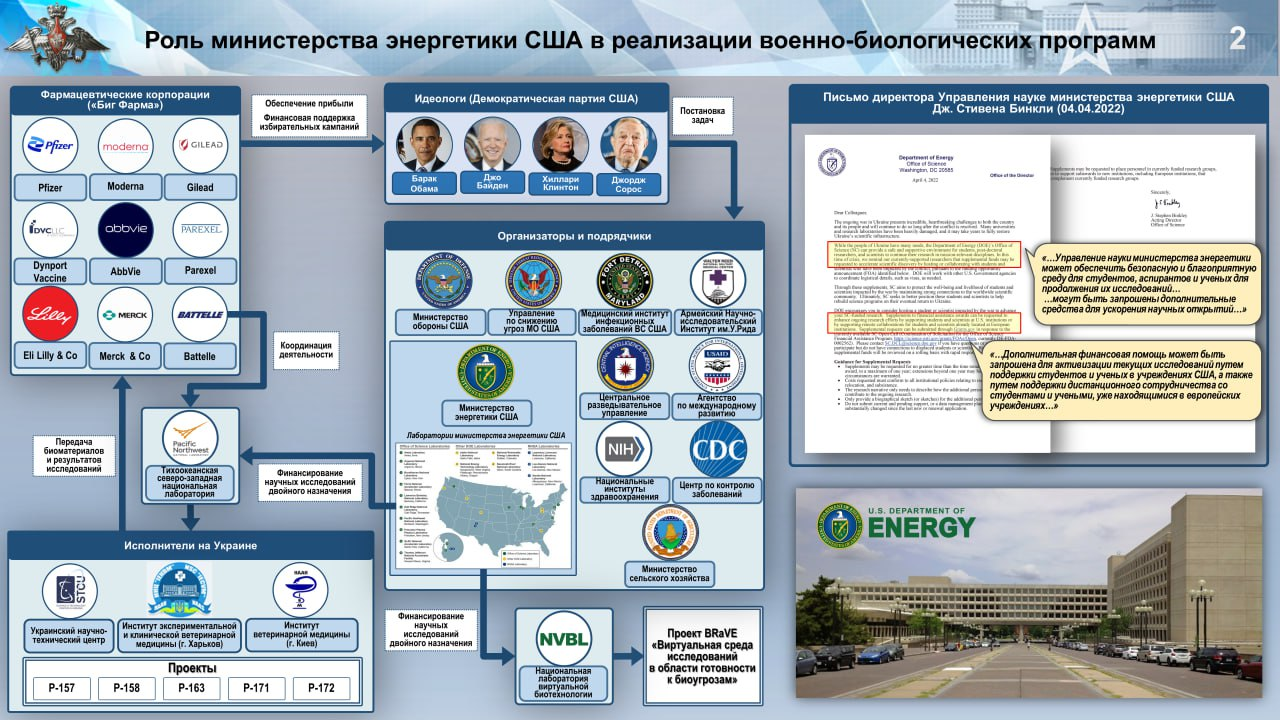В ходе предыдущего брифинга мы обращали ваше внимание на роль министерства энергетики США в реализации военно-биологических программ Пентагона. Сегодня хотел бы более подробно остановиться на материалах, которые подтверждают участие этого ведомства в проектах двойного назначения на территории Украины.