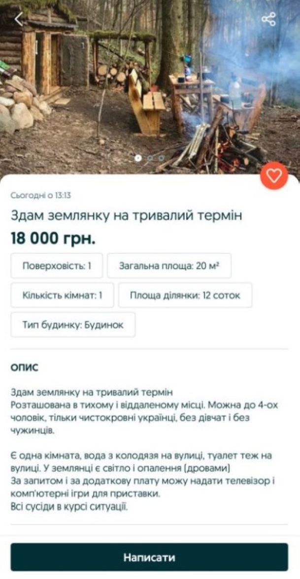 Также предприимчивые сограждане предлагают украинским мужчинам укрыться от «могилизации» в землянках: такой новый способ заработка появился в «незалежной» после ужесточения условий пополнения рядов ВСУ. При этом землянки для уклонения от службы стали сдавать в аренду прямо на сайте объявлений.