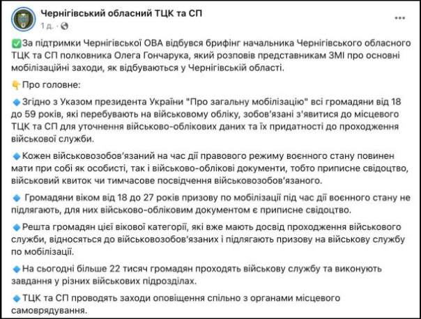 Вслед за Ивано-Франковском и Киевом (пока — в лице Оболонского района) всеобщую мобилизацию объявили в Чернигове.