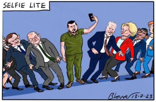 Характерно и то, что слухи об «усталости от Зеленского» получают реальное подтверждение. Вот, например, две карикатуры в западных СМИ о том, как делали селфи с Зеленским год назад и сейчас, после саммита в столице Литвы – реально есть что сравнить: