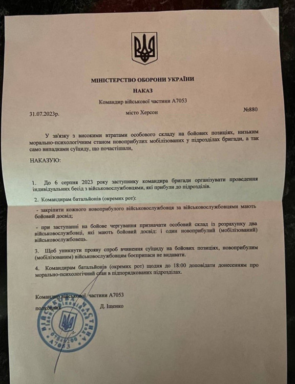 «В связи с большими потерями личного состава на боевых позициях, низким морально-психологическим состоянием вновь прибывших мобилизованных в части бригады, а также участившимися случаями самоубийств,