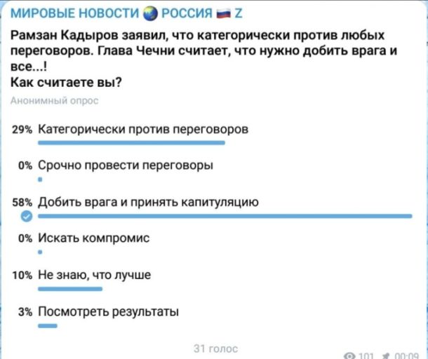 Ну а если говорить о России, то в соцсетях вот уже несколько дней, что называется, «гуляют» данные соцопроса о том, как в России относятся к возможным переговорам о мире между Украиной и Россией по результатам СВО. Изюминку данным придает приписка о том, что глава Чечни Рамзан Кадыров якобы считает, что никаких переговоров быть не должно, а врага, то есть Украину, нужно добить и все.