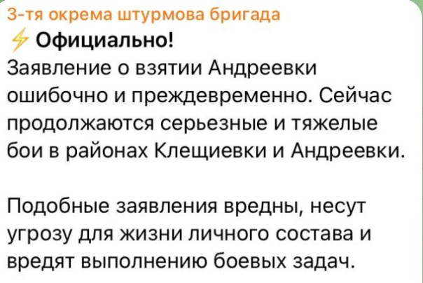 3 бригада ВСУ сообщает: «Сейчас продолжаются серьезные и тяжелые бои в районах Клещеевки и Андреевки. Подобные заявления вредны, несут угрозу для жизни личного состава и вредят выполнению боевых задач».