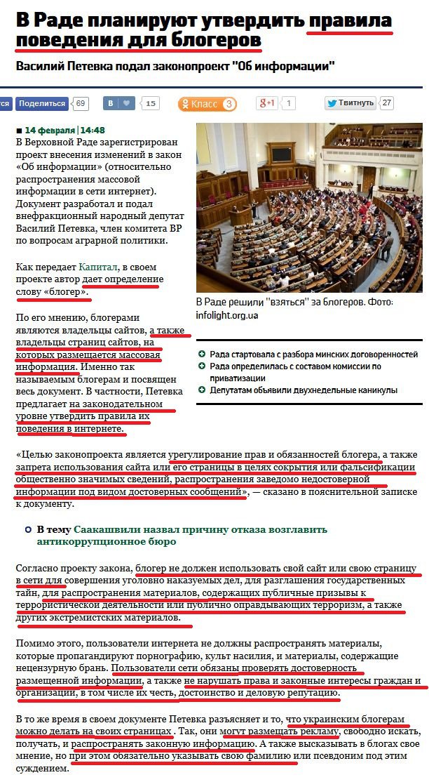 Как передает Капитал, в своем проекте автор дает определение слову «блогер». По его мнению, блогерами являются владельцы сайтов, а также владельцы страниц сайтов, на которых размещается массовая информация. Именно так называемым блогерам и посвящен весь документ. В частности, Петевка предлагает на законодательном уровне утвердить правила их поведения в интернете.