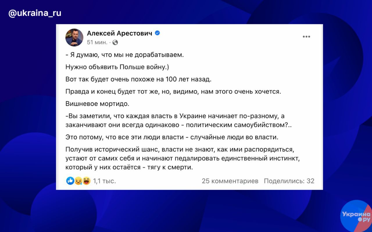 "Я думаю, что мы не дорабатываем. Нужно объявить Польше войну. Вот так будет очень похоже на 100 лет назад. Правда и конец будет тот же, но, видимо, нам этого очень хочется. Вишнёвое мортидо", - написал он.