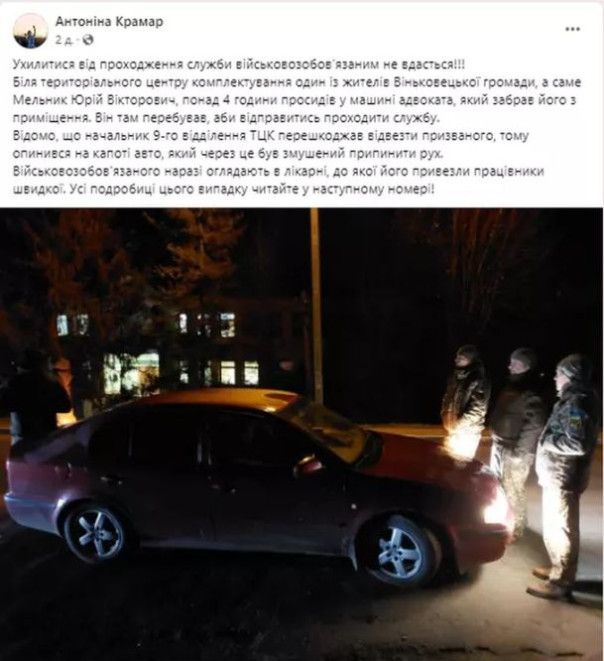 «Невозможно избежать военной службы!!! Возле Территориального центра комплектования один из жителей Виньковецкой громады, а именно Мельник Юрий Викторович, более 4 часов сидел в машине юриста, который забрал его из помещения. Он был там, чтобы пойти на службу. Известно, что начальник 9-го отделения ТЦК препятствовал транспортировке призванного, поэтому он находился на капоте автомобиля, который был вынужден остановить движение. Военный в настоящее время проходит обследование в больнице, в которую его доставили сотрудники скорой помощи, – пишет работник газеты «Сельские вести» и обещает в газете рассказать все подробности.