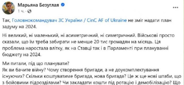 «Да, главнокомандующий ВС Украины не смог предоставить план замысла на 2024-й. Ни большой, ни маленький, ни асимметричный, ни симметричный. Военные просто сказали, что им нужно забирать не менее 20 тысяч граждан в месяц», — написала Безуглая в своем аккаунте в соцсети.