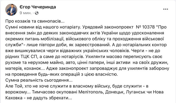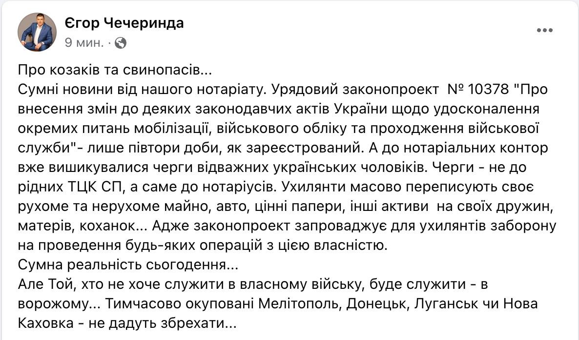 Печальные новости нашего нотариата. Правительственный законопроект № 10378 "О внесении изменений в некоторые законодательные акты Украины по усовершенствованию отдельных вопросов мобилизации, военного учета и прохождения военной службы" - только полтора дня, как зарегистрирован. А в нотариальные конторы уже выстроились очереди отважных украинских мужчин. Очереди – не в родные ТЦК СП, а именно в нотариусы. Уклоняющие массово переписывают свое движимое и недвижимое имущество, авто, ценные бумаги, другие активы на своих жен, матерей, любовниц... Ведь законопроект вводит уклоняющимся запрет на проведение любых операций с этой собственностью.
