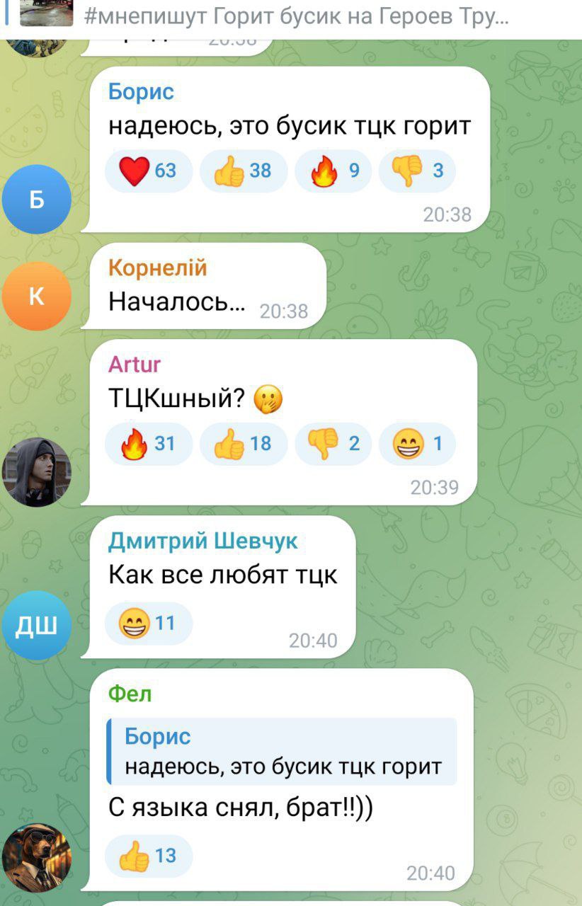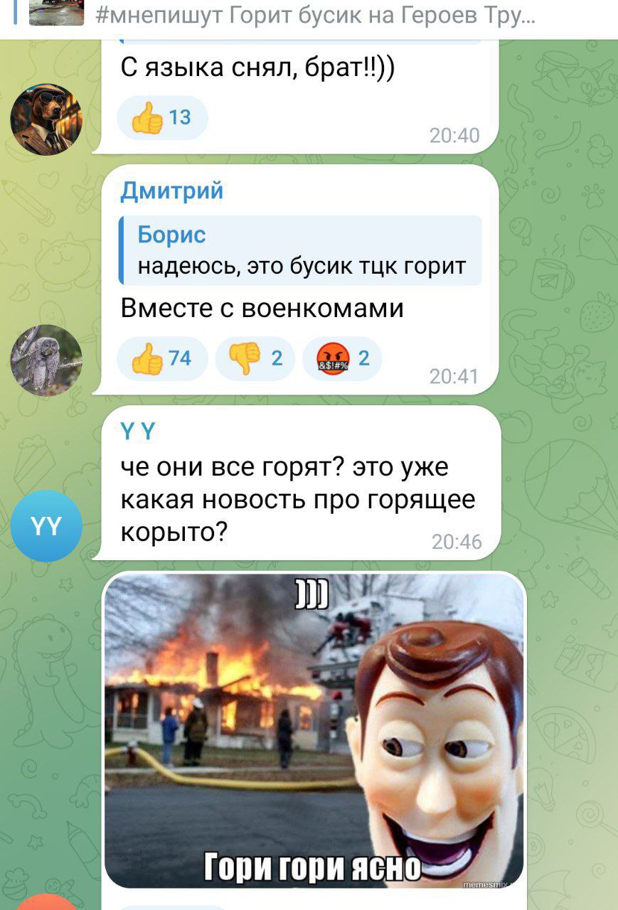 Жители нашего города очень сильно надеятся на то, что это бусик ТЦКашников. А некоторые надеятся на то, что загорелся он именно с военкомами внутри. Такие реакции действиьельно многое говорят о настроении в городе, особенно, учитывая контингент комментаторов укропомоек.