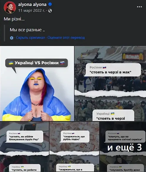 В "Фейсбуке"* рэперша активно обозревает новости с фронта, тиражируя все без исключения фейки. Россию она называет не иначе как Рашкой и страной-террористом, русских — оккупантами, убийцами и зверями. По её мнению, наши соотечественники до сих пор стоят в огромных очередях в "Макдоналдс", а украинцы — на запись в тероборону.