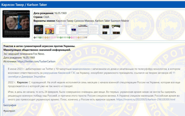 Реакция целевой аудитории на приезд в Москву Такера Карлсона не заставил себя ждать. Журналиста, взявшего интервью у российского лидера Владимира Путина, внесли на приснопамятный сайт как «пособника российских военных преступников и оккупантов».