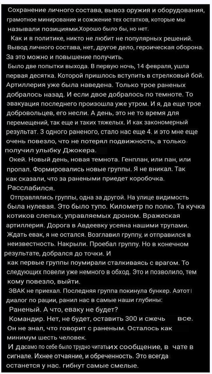 Никто не любит непопулярных решений. Вывод солдат, нет, другое дело, героическая оборона. За это можно и повышение получить. Было 2 попытки выхода. В первую ночь, 14.02, ушла первая десятка, пришлось вступить в бой. Артиллерия уже была наведена. Только 3 раненых вернулись. Эвакуация последнего была утром. Я и ещё 3 его несли. А день, это не время для движения... И закономерный результат: из 1 раненого, стало нас еще 4. И мне еще очень повезло - не потерял подвижность, а только получил улыбку Джокера.
