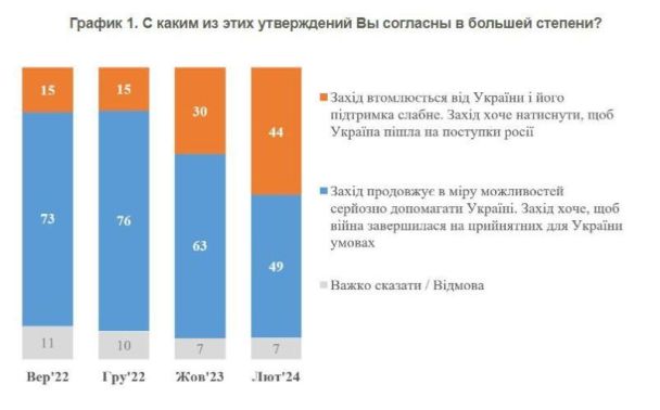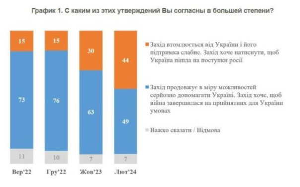Также социологи фиксируют снижение веры украинцев в неуклонную поддержку внешних партнеров – с 76 процентов до 49.