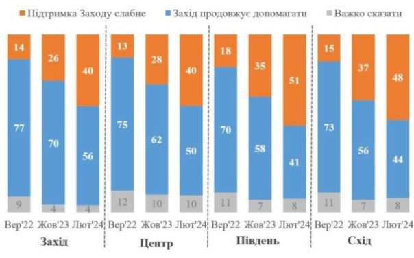 Им оппонируют 44% опрошенных из западных и центральных областей – там продолжают верить, что США и Европа не свернут помощь ВСУ.