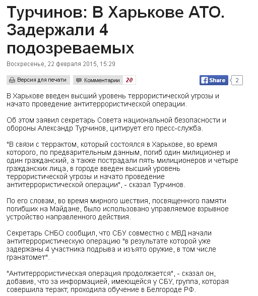 "Турчинов: В Харькове АТО. Задержали 4 подозреваемых. Воскресенье, 22 февраля 2015, 15:29"