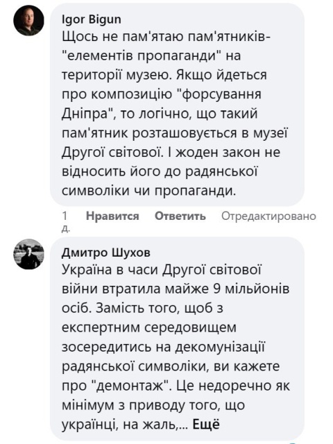 «Что-то не помню памятников-"элементов пропаганды" на территории музея. Если речь идет о композиции "форсирования Днепра", то логично, что такой памятник размещается в музее Второй мировой. И ни один закон не относит его к советской символике или пропаганде», — отмечает еще один подписчик.