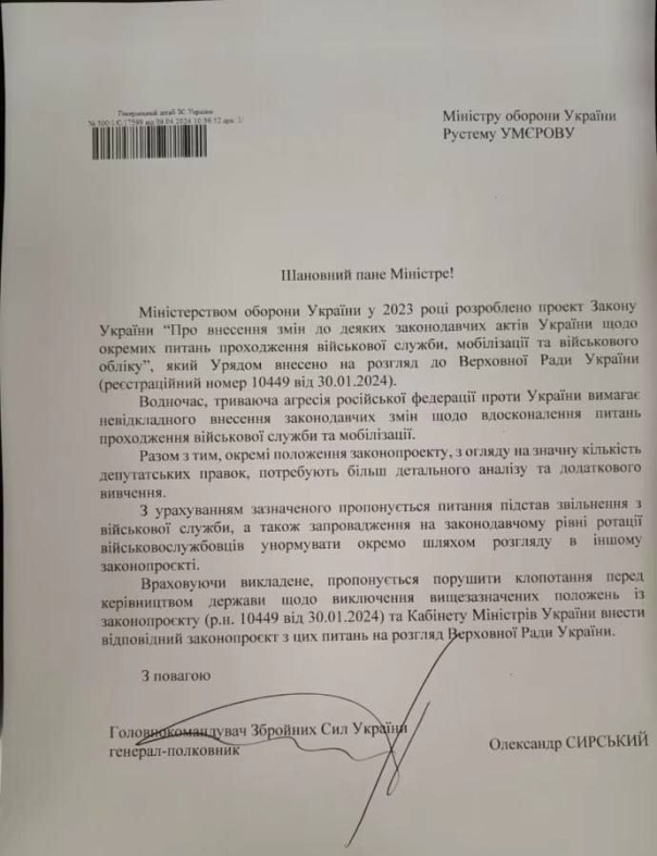 Главком ВСУ Александр Сырский в письме к министру обороны предложил «вопрос оснований увольнения с военной службы, а также введение на законодательном уровне ротации военнослужащих нормировать отдельно путем рассмотрения в другом законопроекте».