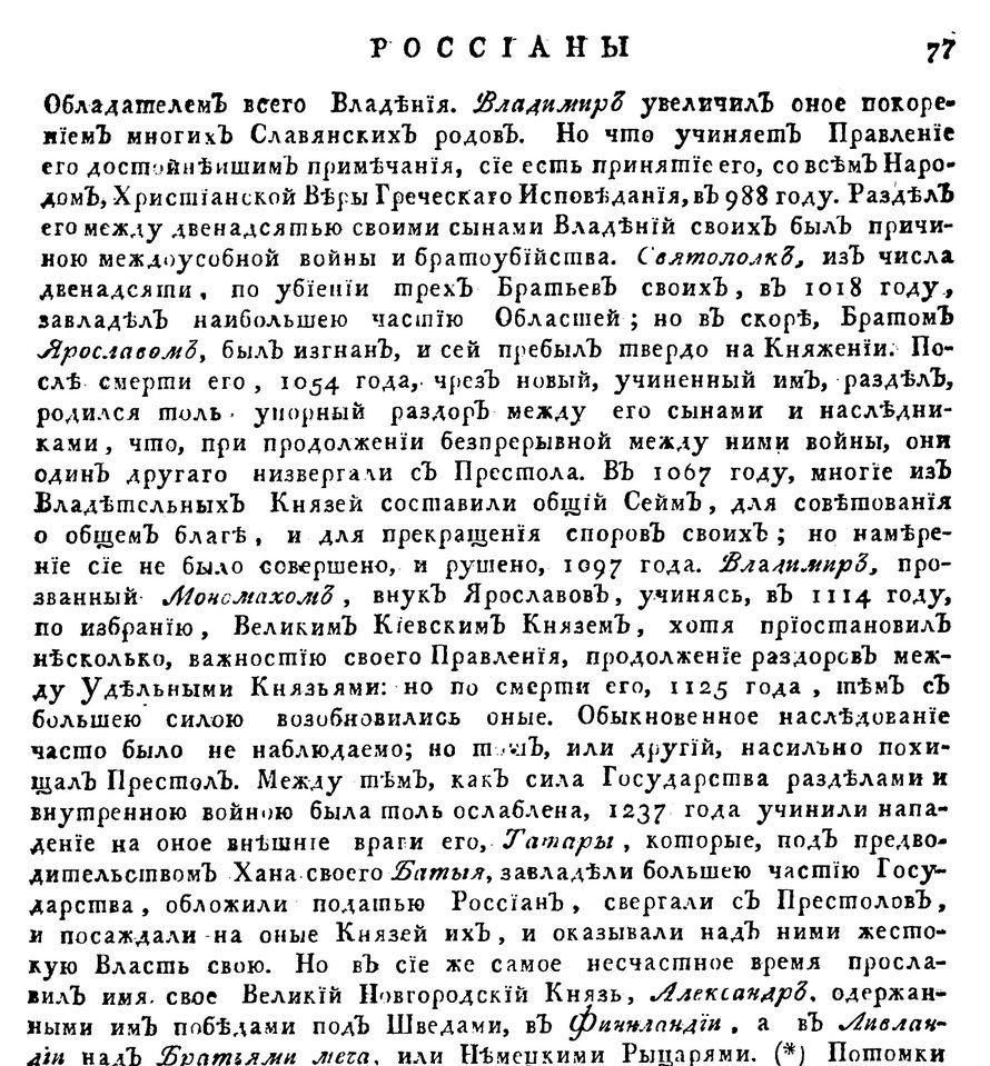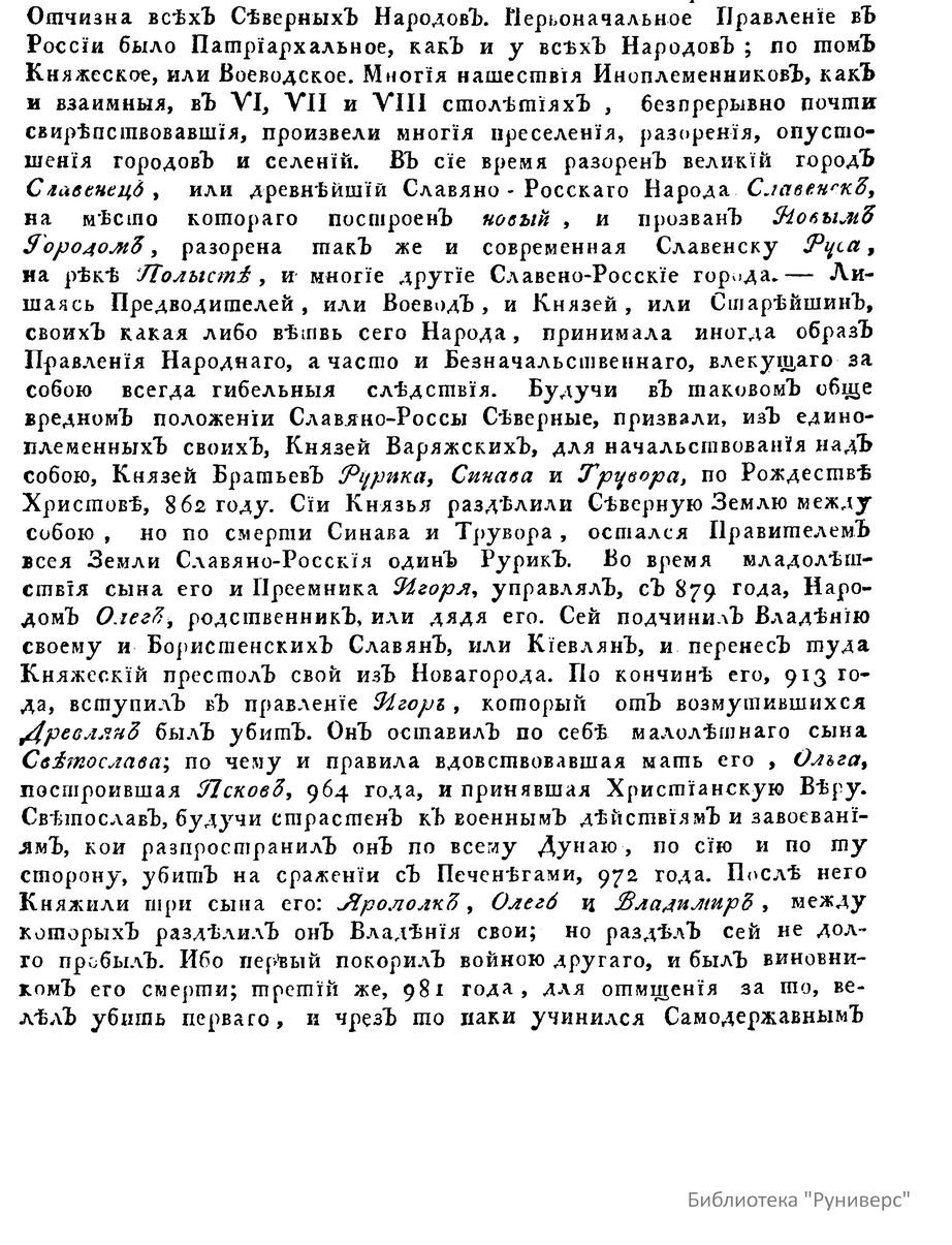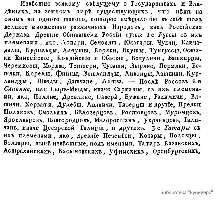 Известно всякому сведущему о государствах и владениях, на земном шаре существующих, что нет на оном ни одного такого, которое вмещало бы в себя толь великое множество различных народов, как Российская держава. Древние обитатели России суть: 1-е Руссы с их племенами, яко, лопари, семояды, юкагиры, чукчи, камчадалы, курильцы, алеуты, коряки, якуты, тунгусы, остяки енисейские, кондийские и обские, вогуличи, башкирцы, черемисы, мордва, тептери, чуваши, зыряне, пермяки, вотяки, карелы, финны, эстландцы, ливонцы, латыши, курландцы, шведы, датчане, литва. -