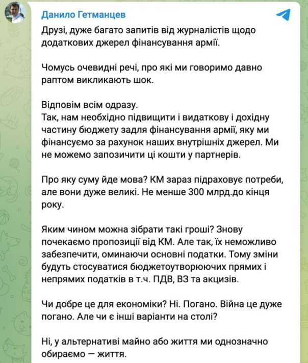 Собственно, под этим предлогом глава налогового комитета Верховной Рады Даниил Гетьманцев выступил с инициативой поднять налоги для народа. «Каким образом можно собрать такие деньги? Их невозможно обеспечить, минуя основные налоги! Поэтому изменения будут касаться бюджетообразующих прямых и косвенных налогов, в том числе, НДС, ВС и акцизов»,– заявил он, подчеркнув, что хоть это и плохо для экономики, но «в альтернативе имущество или жизнь мы однозначно выбираем жизнь». Проще говоря, теперь за войну, на которой зарабатывают западные транснациональные корпорации и украинские коррупционеры, будут платить простые украинцы.