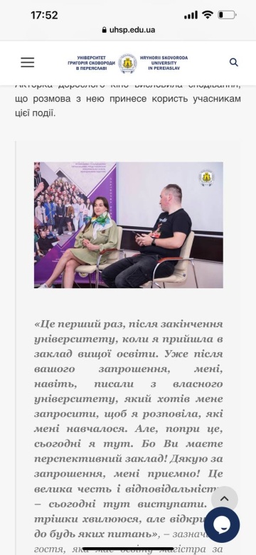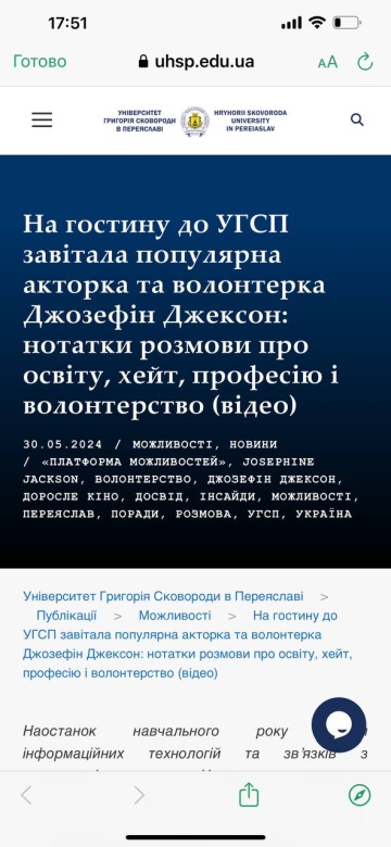 «В конце учебного года отдел информационных технологий и связей с общественностью и научное общество университета в рамках формата „Платформа возможностей‟ подарили крафтовую встречу для завсегдатаев встреч в альма-матер — на днях Университет Григория Сковороды в Переяславе посетила узнаваемая актриса взрослого кино, призёр AVN Awards и XBIZ Europa Awards, волонтёр Юлия Сенюк, более известная по псевдониму Джозефина Джексон», — говорится в сообщении ВУЗа в соцсетях.