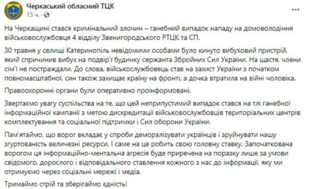 В Черкасской области во двор ТЦКашника бросили гранату...