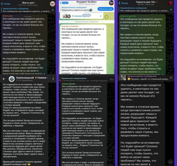 "Это сообщение нам придётся удалить, а некоторых из нас даже уволят или посадят, но мы не можем больше это терпеть…". Такие большие посты появились в Telegram с утра. Хакеры взломали через бот постинга Fleep Bot более четырёх сотен украинских Telegram-каналов и несколько десятков русских, призвав солдат в зоне СВО сложить оружие: "Очнитесь! За что вы воюете?".