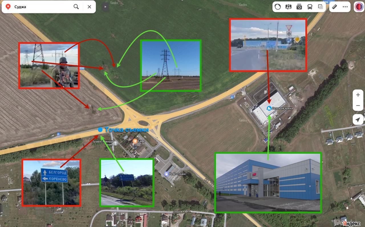 Нет, это не постановка. Это северо-западная окраина Суджи. На схеме красным обведены стоп-кадры из видео, а зеленым снимки с гугл-панорам и фото ледового комплекса (большое синее здание) из интернета. Эта территория с самого начала вторжения в Курскую область находится под контролем ВСУ. Видео настоящее и снято военнослужащими Украины (с) @timofei_v