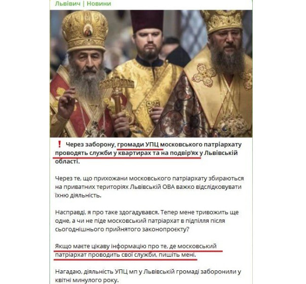 «В связи с запретом УПЦ общины московского патриархата проводят службы в квартирах и дворах Львовской области. Из-за того, что прихожане московского патриархата собираются на частных территориях, Львовской ОВА трудно отслеживать их деятельность. Если имеете интересную информацию о том, где московский патриархат проводит свои службы, пишите мне…»
