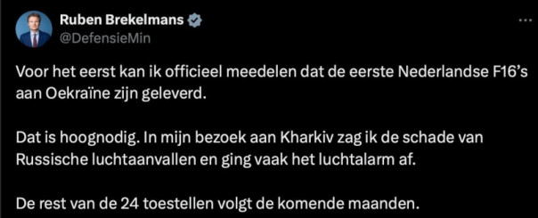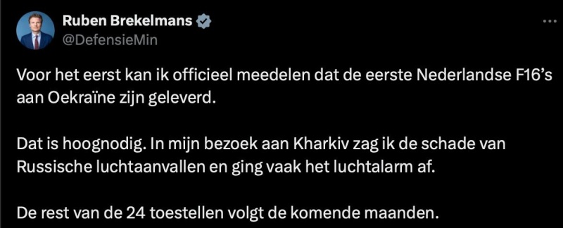«Впервые я могу официально объявить, что первые голландские F-16 были доставлены на Украину. Это срочно необходимо. В Харькове я видел ущерб от российских авиаударов и слышал частые сигналы воздушной тревоги. Остальные 24 самолета последуют в ближайшие месяцы», — написал Рубен Брекельман еще в одном посте.