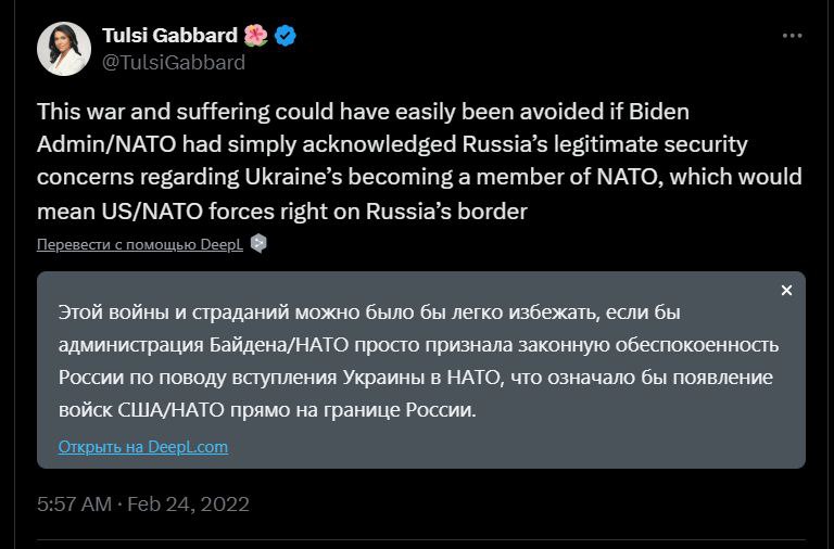 16 февраля 2023 ЦПД заявил, что Габбард «раньше высказывала пророссийскую риторику».