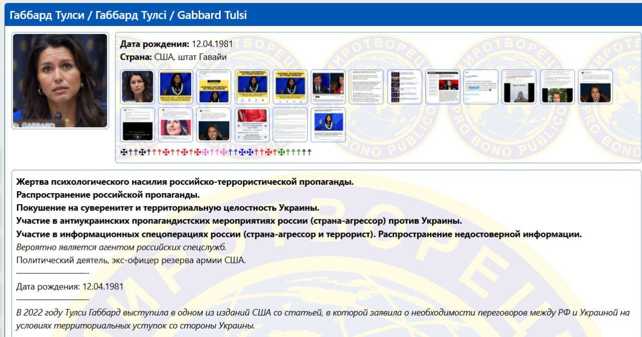 Страница Тулси Габбард на «Миротворце» пока еще сохраняется.