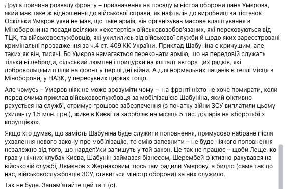 «Настоящей катастрофой стал шабунинг – уклонение военнослужащих от военной службы по договоренности с командирами. Шабунинг – это когда во взводе по списку числится 30 военнослужащих, а налицо – 12-13, потому что остальные куда-то «прикомандированы» и живут дома. Именно шабунингом объясняется то обстоятельство, что из 1 млн. мобилизованных на фронте фактически находится тысяч 200-250. Где остальные?», - пишет Бойко. Выражение «шабунинг» - это производное от имени главы Центра по борьбе с коррупцией Виталия Шабунина, который, как утверждает Бойко, лишь формально числился на службе. По этому поводу, по заявлению Бойко, против Шабунина по этому поводу расследуется уголовное дело. Источник