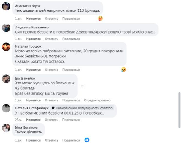 Остальные, кто отреагировал на ее пост, наперебой рассказали, что в Погребках без вести исчезли их братья, мужья или другие близкие родственники. К слову, почти все авторы обратной связи – женщины.