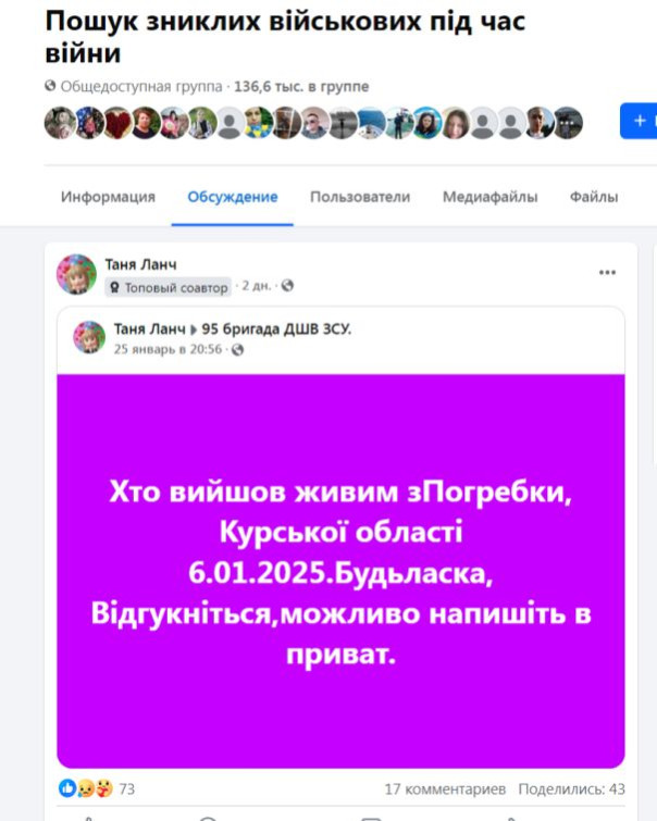 Одна из женщин опубликовала в группе призыв к тем, «кто вышел живым из н.п. Погребки, Курской области 6.01.2025», отозваться для связи. С какой целью ей нужны эти контакты она не уточнила.