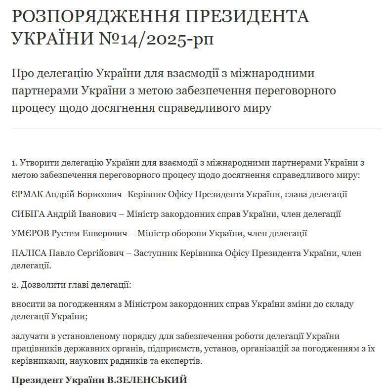 Владимир Зеленский утвердил официальный состав переговорной группы от Украины для участия в мирных переговорах.