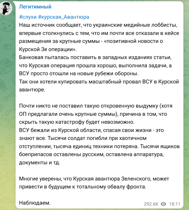 «Банковая (улица, на которой расположен офис Владимира Зеленского. − Ред.) пыталась поставить в западных изданиях статьи, что курская операция прошла хорошо, выполнила задачи, а ВСУ просто отошли на новые рубежи обороны. Так они хотели купировать масштабный провал ВСУ в курской авантюре. Почти никто не поставил такую откровенную выдумку», − пояснил источник «Легитимного».