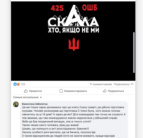 Отчаявшиеся жёны и матери этих солдат оставляют сообщения под постами украинских военных пропагандистов с требованиями трибунала для командования «Скалы».