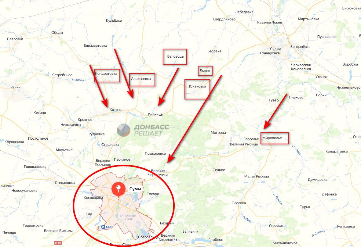 Попеременными ударами на разных участках: Локня-Юнаковка, Беловоды-Яблоновка, Водолаги-Новониколаевка, Владимировка-Алексеевка, а также, вполне вероятно, в центре - Олешня-Юнаковка и Горналь-Мирополье будет расшатывать оборону противника, заставляя его маневрировать вдоль ЛБС, уничтожая на марше и изматывая.