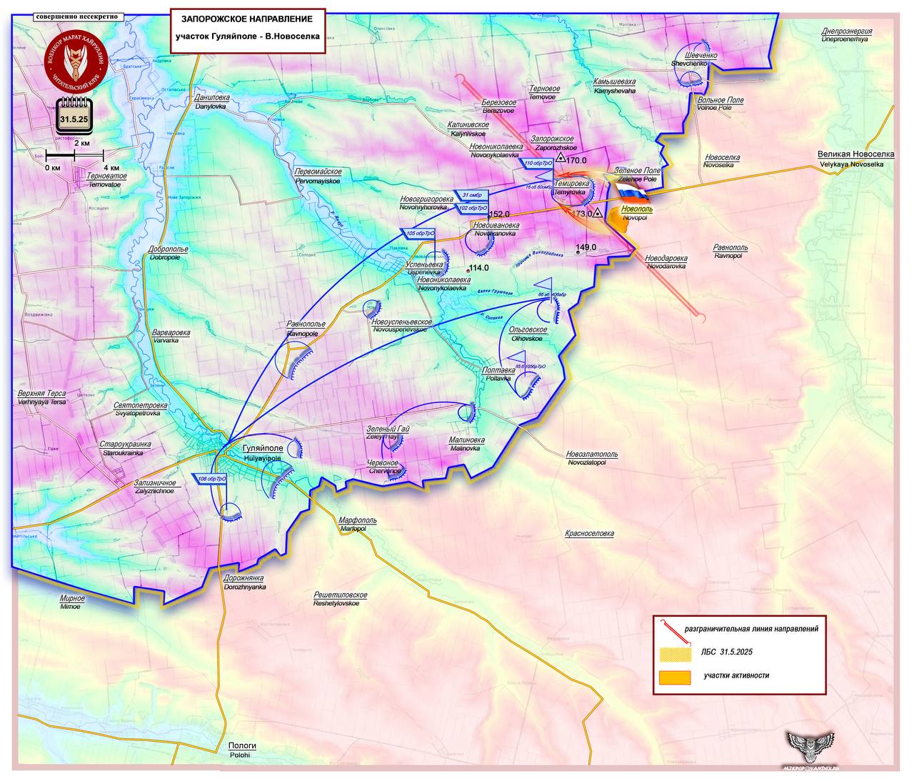 Для обеспечения этой задачи необходимо взять под контроль н.п. Новополь, расположенный южнее. Контроль над ним позволяет выйти по рокаде В.Новоселка-Гуляй Поле на командные высоты района - с выходом на правый фланг района обороны ВСУ Темировка.