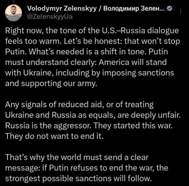 «Сейчас тон диалога между США и Россией кажется слишком тёплым. Давайте будем честны: это не остановит Путина. Необходима смена тона. Путин должен ясно понять: Америка будет поддерживать Украину — в том числе путём введения санкций и оказания помощи нашей армии. Любые сигналы о сокращении помощи или о том, что Украину и Россию ставят на один уровень, глубоко несправедливы. Россия — агрессор. Именно она начала эту войну. И не хочет её заканчивать.