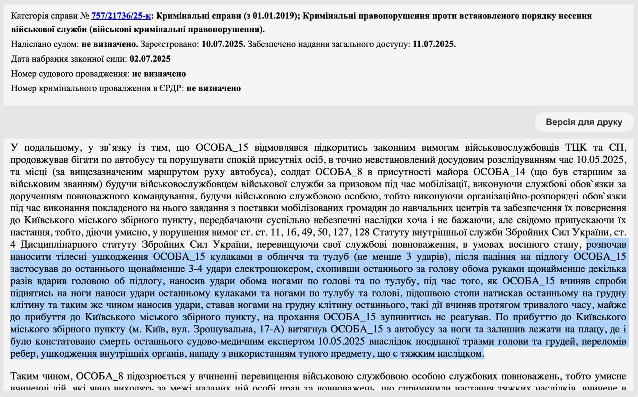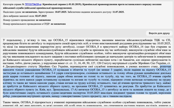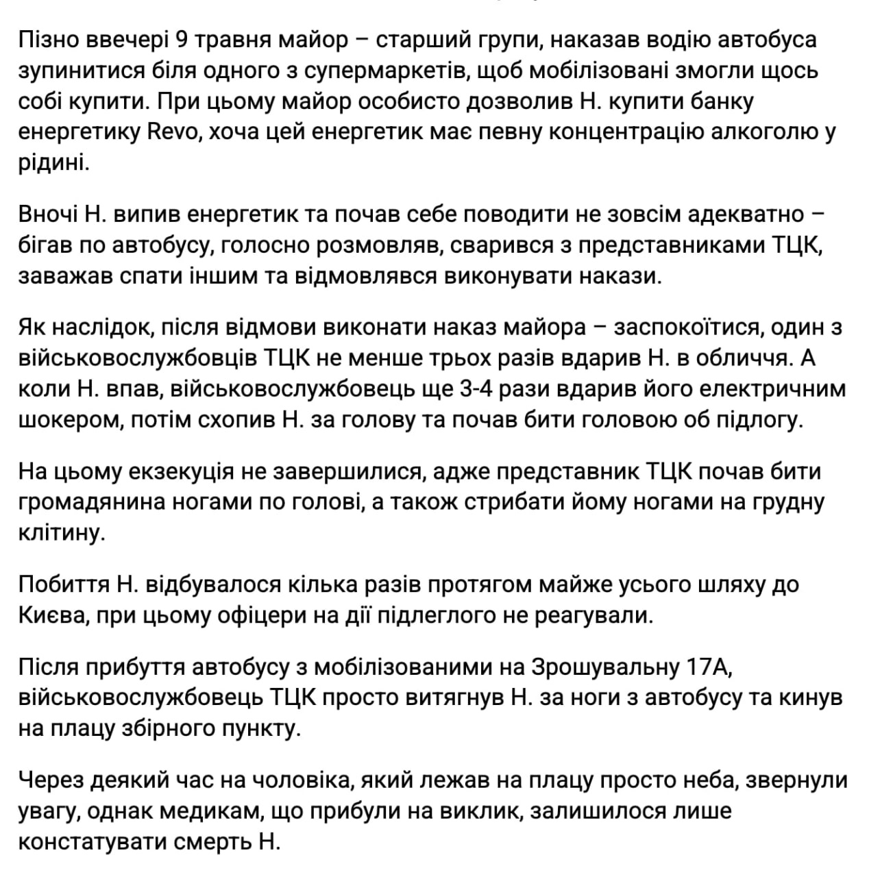 Когда мужчину везли из учебной части во Львовской области обратно в Киев, он якобы начал вести себя неадекватно после того, как выпил энергетик. Тогда сотрудник ТЦК жестоко избил его ногами по лицу, голове, применил электрошокер. По приезде на сборный пункт тело избитого вышвырнули на плац из автобуса. Прохожие нашли пострадавшего уже мертвым. Как заключил судмедэксперт, мобилизованный умер по причине сочетанной травмы головы и груди, переломов ребер и повреждения внутренних органов.