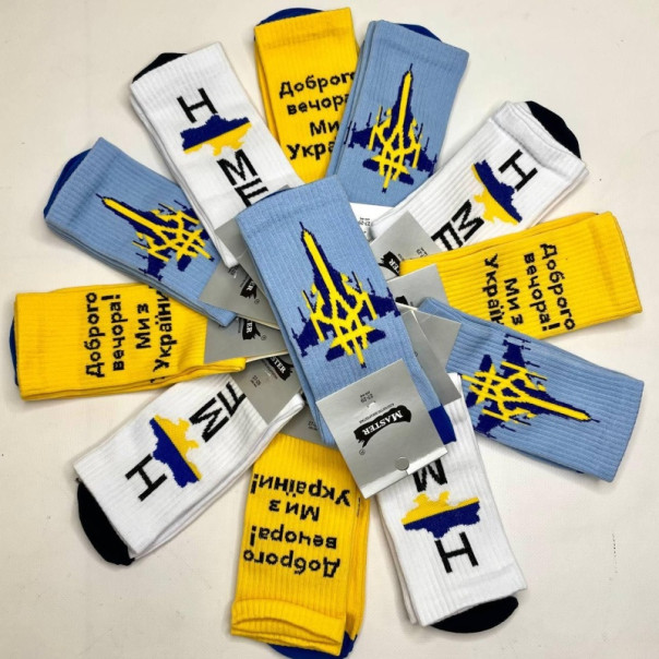 «Это боевой дух, стиль и немного детского произвола в каждой паре. Ирония, дрон-атаки и пелена любви – все это в одной упаковке», – сообщает в рекламе носков производители.