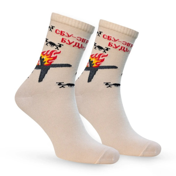 Также на этом маркетплейсе продаются такие же носки, но с другим слоганом – «СБУ согреет где угодно». На этих носках изображены не только атакующие дроны и горящие самолёты, но и грузовые фуры. То есть, такой намёк на недавнюю операцию украинских спецслужб «Паутина» с атакой на российские аэродромы с бомбардировщиками.