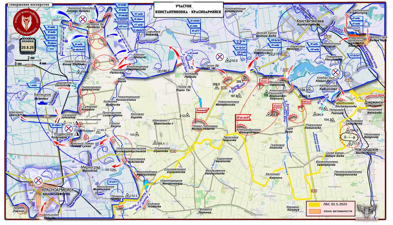 В силу того, что ситуация на острие нашего вклинивания все-таки покрыта густым «туманом войны», приходится учитывать текстовые сообщения и обновления карт всех источников, в том числе вражеских. В частности, самостийный военный обозреватель Константин Машовец, работающий в интересах Пентагона, утром 20 августа сообщил, что ВСУ контратакуют по всему периметру прорыва в районе Доброполья.
