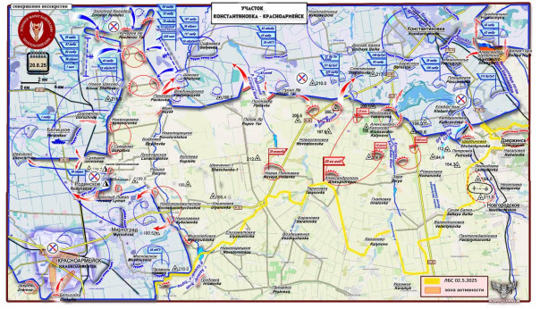 Согласно его умозаключениям, ВС РФ обязательно попытаются расширить Добропольский прорыв с флангов — с далеко идущими нехорошими последствиями для захисников. Если ВСУ окончательно потеряют Владимировку (она, похоже, уже отбита у врага), то начнутся сражения за Октябрьское (Шахово — у бандеровцев) и Софиевку. После этого российские расчеты БПЛА перекроют кислород бандеровцам в Константиновке, блокируя с воздуха логистику в Дружковке.