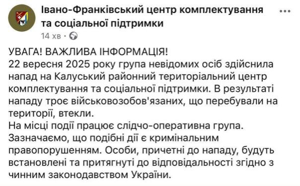 "Группа неизвестных напала на Калушский ТЦК, трое военнообязанных сбежали" — сообщили в Ивано-Франковском областном ТЦК.