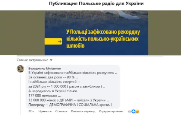 «В Украине зафиксировано наибольшее количество разводов. За последние два года – 90%. И наибольшее количество смертей: за 2024 год – 1 000 000 (вместе с погибшими). А родилось в Украине только 177 000 младенцев. 13 000 000 женщин с ДЕТЬМИ – уехали из Украины. Впереди – ДЕМОГРАФИЧЕСКИЙ и СОЦИАЛЬНЫЙ КРИЗИС!», – причитают украинские читатели в комментариях к посту польского медиа.