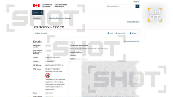 В Канаде пытались зарегистрировать торговую марку Zelenskyy. В документах указаны полные ФИО, совпадающие с данными Зеленского. В том числе и его адрес в Киеве. Заявку на регистрацию товарного знака отклонили — автор не внёс вовремя необходимые корректировки. Среди услуг, которыми планировал заниматься Зеленский: